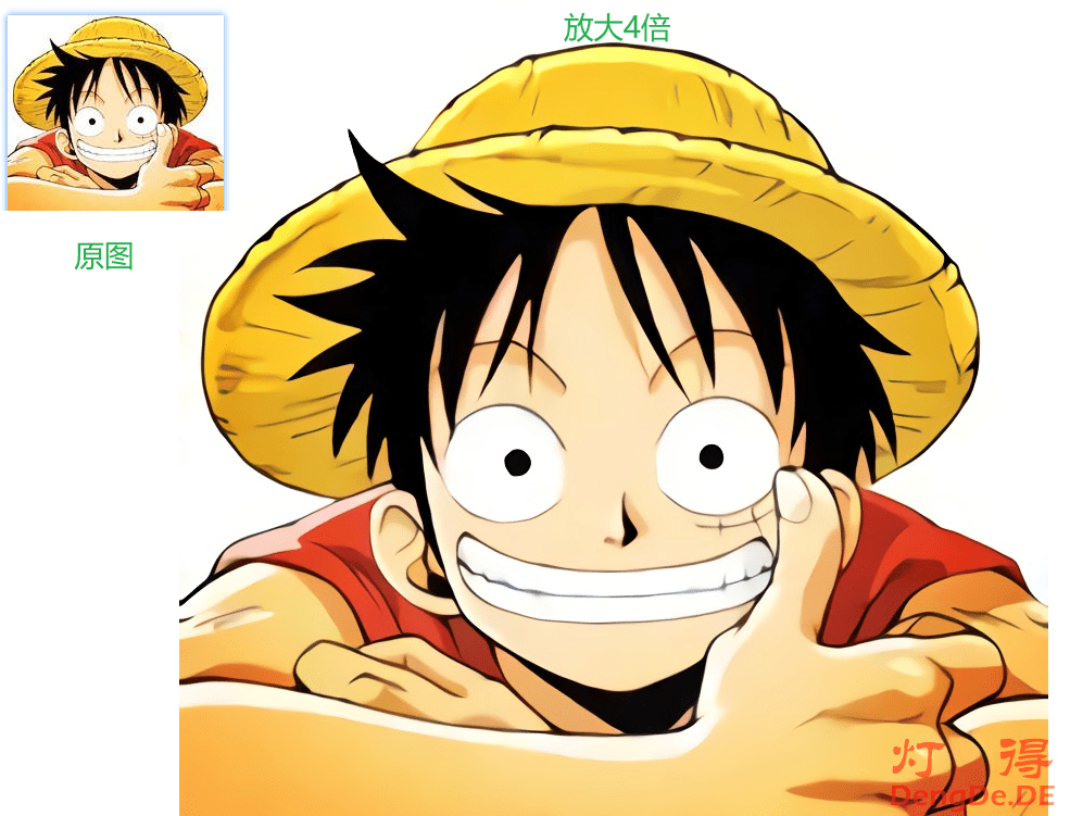 一般情况下,主流的图片分为卡通插画类和照片实物类。在特定的细分领域,还可以进行专注性地训练,以实现最为精准的输出。目前,AI算法对卡通插画处理得较为完美,无论是色彩、细节,还是边缘处理等都有非常出色的表现。比如,下面这张海贼王放大4倍后的图,效果不同凡响。