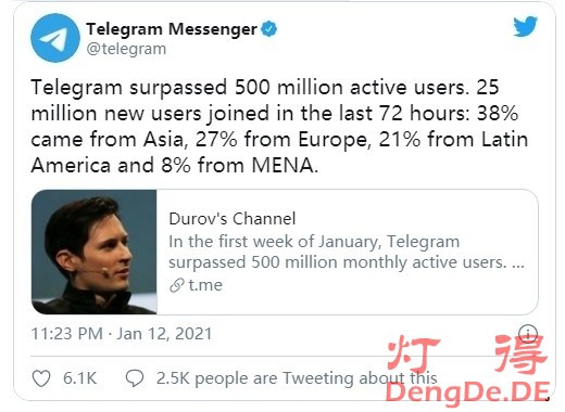 Telegram,非官方简称TG,中文名叫电报,是一款主打私密、安全的跨平台的全球社交通信软件。用户可以在Telegram上相互交换加密与自毁消息,发送照片、影片等所有类型文件,主要用户在欧洲和南美洲,曾在南美洲五个最大国家和欧洲的四个国家成为排名第一的聊天工具。2021年1月12日,尼古拉·杜洛夫官宣,Telegram在全球活跃用户量超过5亿。Telegram由俄罗斯兄弟尼古拉·杜洛夫(Pavel Durov)和帕维尔·杜洛夫于2013年创办,其中,帕维尔·杜洛夫还是俄罗斯知名社交网站vkontakte的创始人。