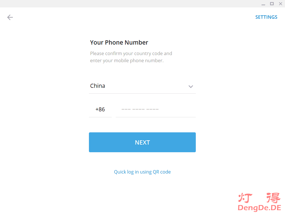 2)在“Your Phone Number”界面,先选择你注册Telegram账号的手机号所在的国家或地区,然后输入你的手机号码后,并点击“NEXT”按钮。如下图所示:
