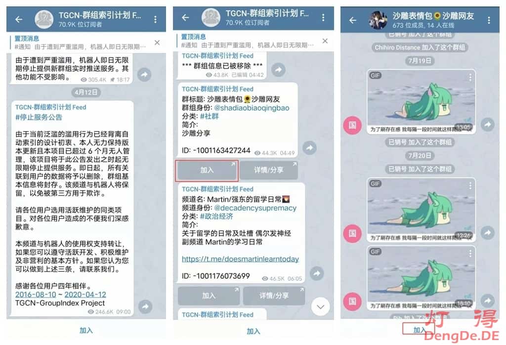 我们可以在Telegram搜索框内输入“@zh_groups”,就可以看到“TGCN-群组索引计划 Feed”频道啦!点进这个账号的主页,并“关注频道”。虽然这个频道已经停止服务,但并没有关闭,我们依然能从以前的记录里找到其它群组。找到你感兴趣的TG群组,在群组界面点击“加入群组”按钮即可。如下图所示: