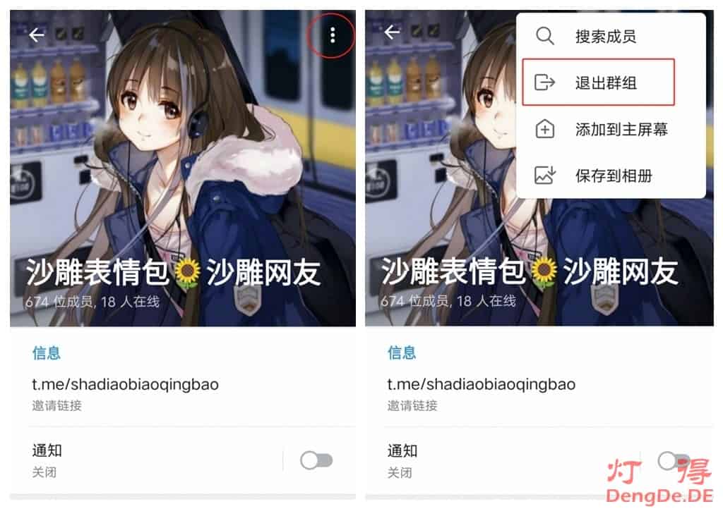 如果你发现对这个群的聊天内容不感兴趣,可以退出群组。在群组聊天界面,我们点击右上角的三个竖点按钮,在弹出的菜单中,选择“退出群组”即可。你也可以通过点击群组头像,在弹出的群组资料界面,点击右上角的三个点按钮,在弹出的菜单中,选择“退出群组”,效果都是一样的。如下图所示: