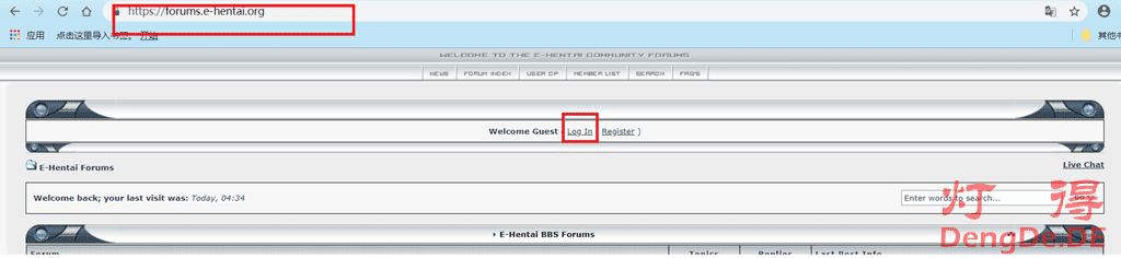 (1)启用E站加速器梯子软件,登陆E站论坛,在弹出页面中点击“Log In”链接。如下图所示: