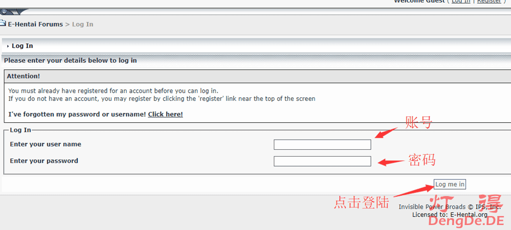 进入到E站论坛登录界面,输入账号和密码,然后点击“Log me in”登录按钮。如下图所示: