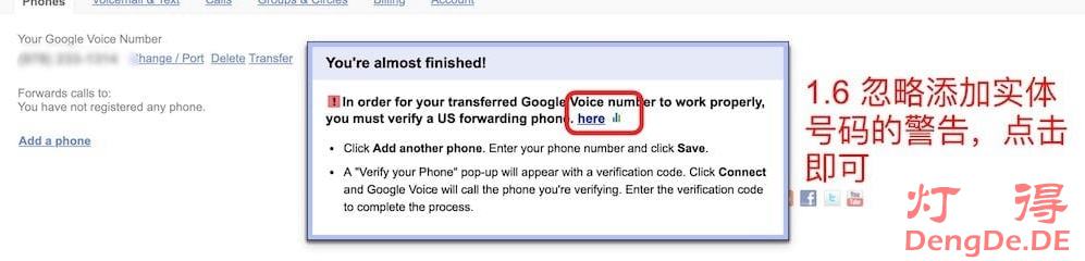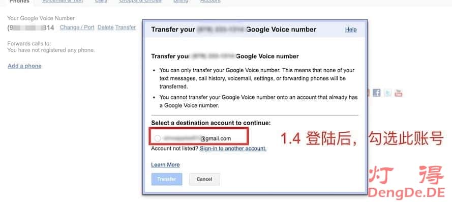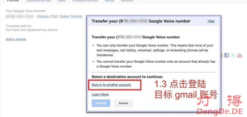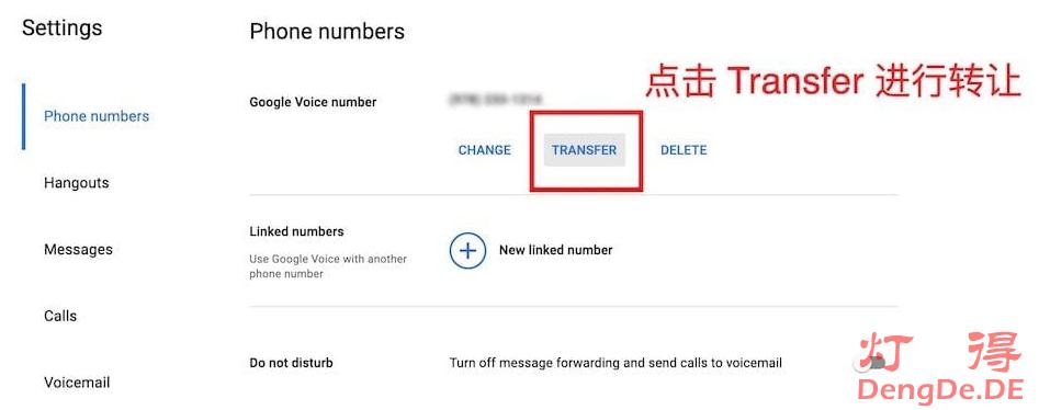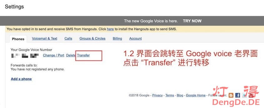 (2)会自动跳转旧版本的 Google Voice 管理界面,继续点击“Transfer”按钮。