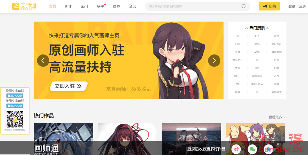 画师通网站以黄色为主色调,页面布局以大banner通栏作为首页布局,提供了pixiv站画师的最新、热门、日榜、周榜、月榜、资讯的浏览,其更像是p站 + 部分自有插画的结合体,可以通过移动端网页和Pixiv镜像App进行访问。