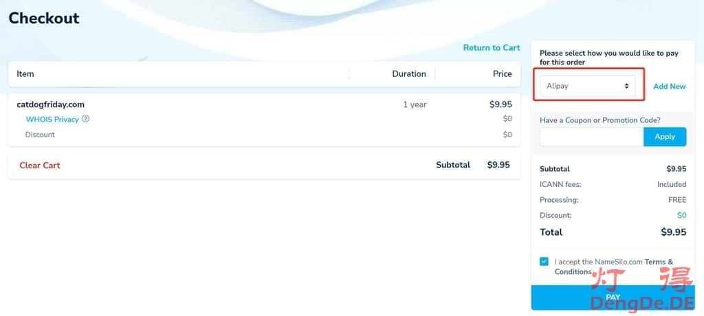 登录或注册好NameSilo账户以后,选择支付方式,可以使用支付宝付款。如下图所示: