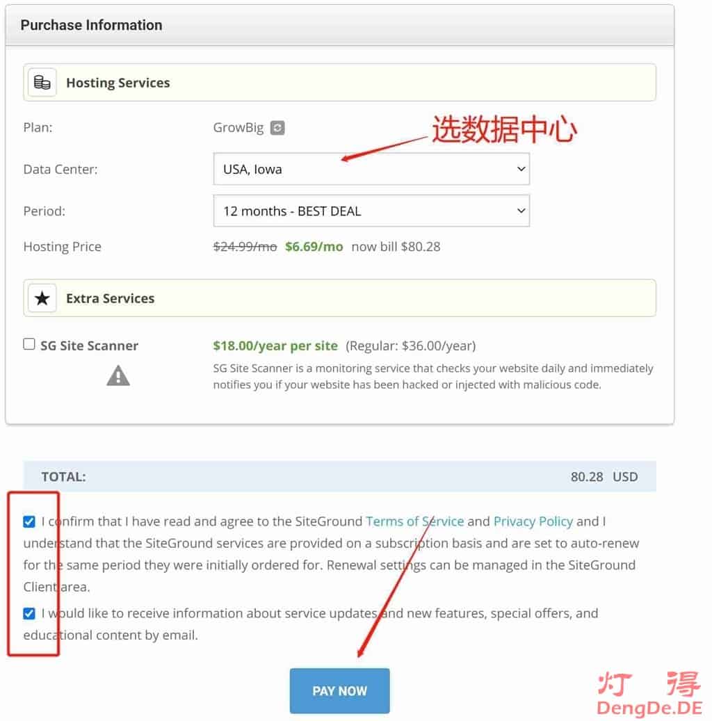 默认情况下,SiteGround会根据你的IP地址,就近给你分配一个数据中心,大家可以根据自己的需要选择数据中心,这里灯得选择美国数据中心。如下图所示:
