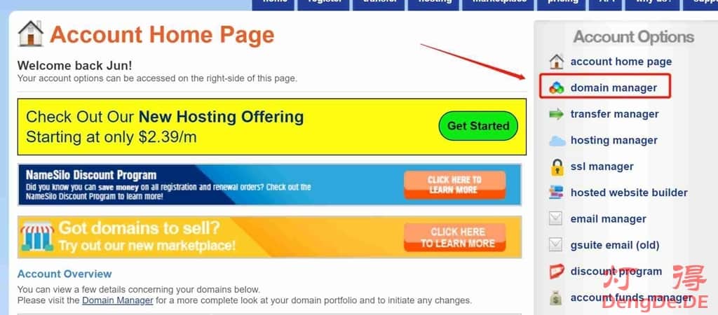 3、在NameSilo域名控制面板修改DNS