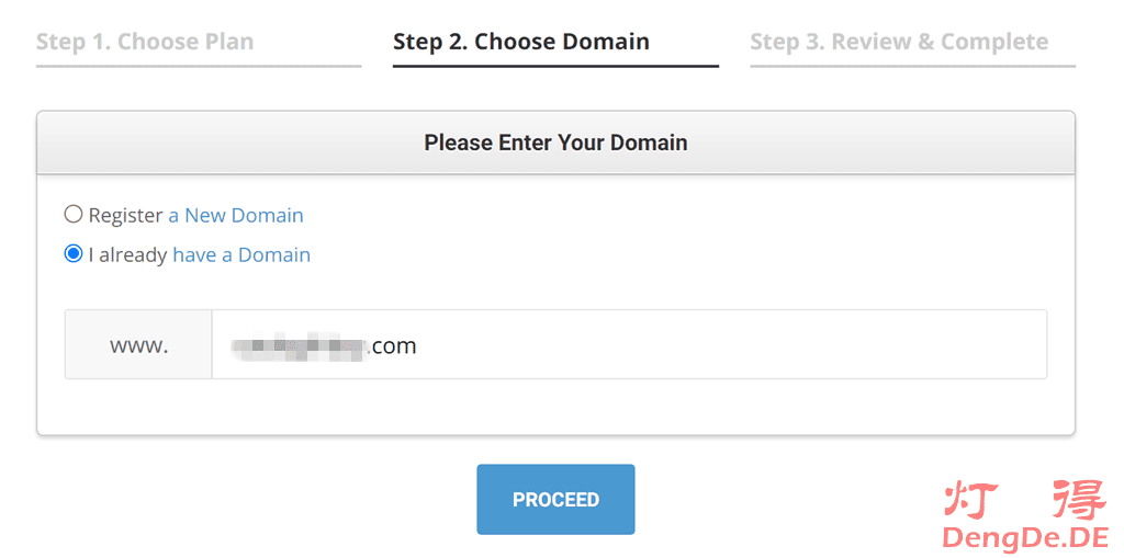 虽然NameSilo域名也涨价了,比如从8.99美元涨到9.95美元,但是依然比SiteGround的域名便宜。因为我们已经在Namesilo购买了域名,所以我们选择“I already have a Domain”,并输入我们已经注册好的域名。如下图所示: