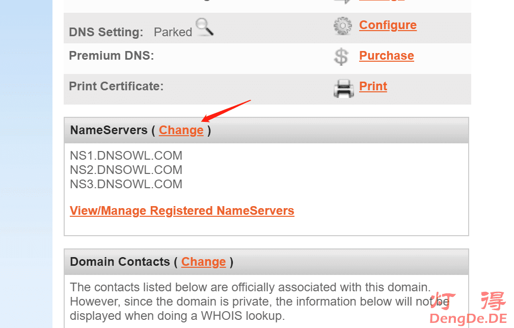首先,我们要把域名的NameServers修改成SiteGround的域名服务器:ns1.siteground.net, ns2.siteground.net,点击我们刚刚注册好的域名,打开域名控制面板,找到“NameServers”这一栏,点“Change”。如下图所示: