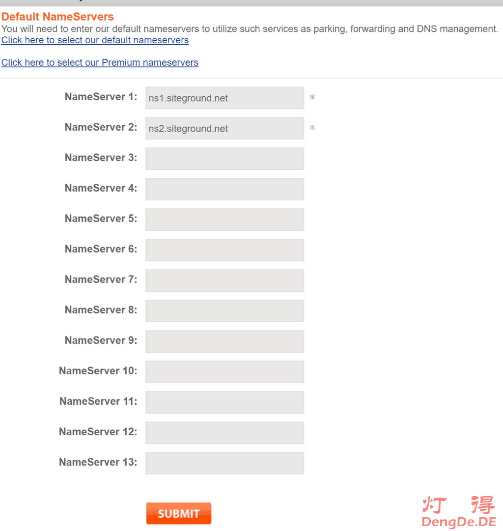 修改NameSilo域名服务器:在下图中把NameServer 1改成ns1.siteground.net,NameServer 2改成ns2.siteground.net,删除NameServer 3,然后点“SUBMIT”,保存。如下图所示: