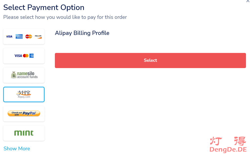 选择NameSilo支持的付款方式,点左下角的”Show More”可以看到更多的付款方式,例如支付宝、微信、PayPal和银行卡付款等,我这里选择支付宝进行演示。选择完成后,效果如下图所示: