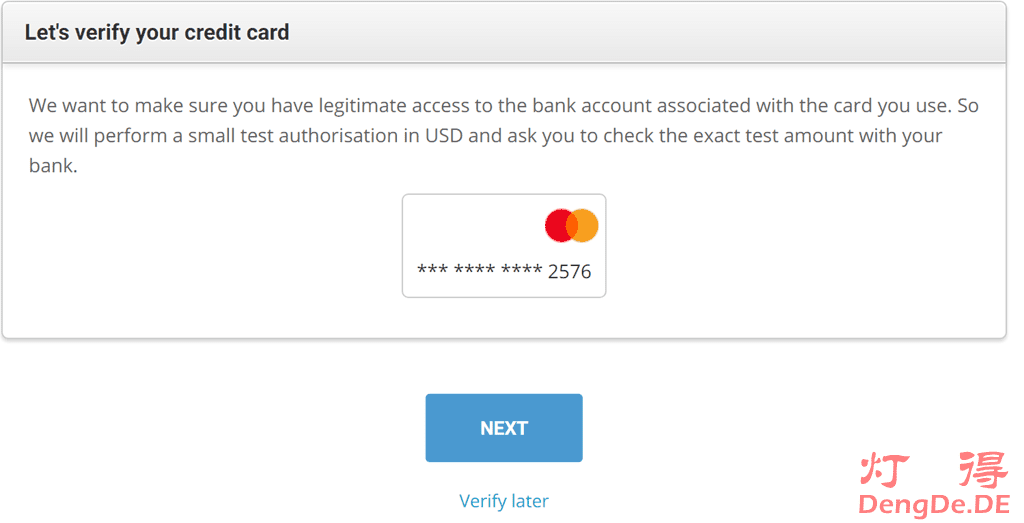 验证方式:从你输入的信用卡上扣除一小笔资金用于验证。如下图所示: