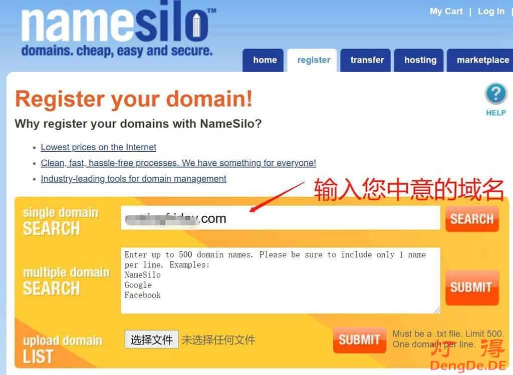 打开www.namesilo.com,在下图所示的输入框中输入您想要注册的域名。如下图所示: