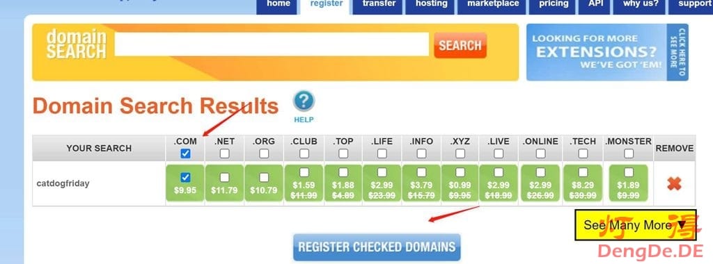 选择.com域名,然后点”RERISTER CHECKED DOMAINS”。如下图所示: