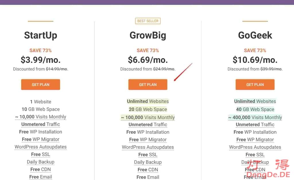 选中您打算购买的套餐后,点“GET PLAN”。现在这个价格应该是活动价,灯得下单时:GrowBig套餐是9.99美元/月,而Startup套餐是6.99美元/月,所以现在入手很划算!