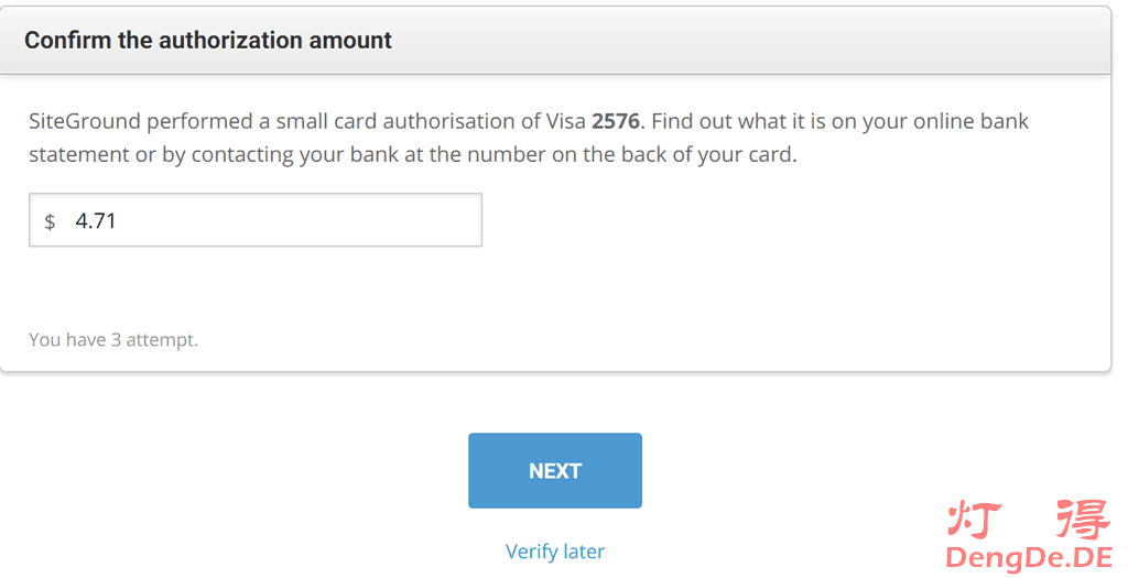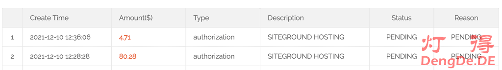 SiteGround说是小额验证,其实也不算小,比如灯得收到的验证金额是4.71美元,如图: