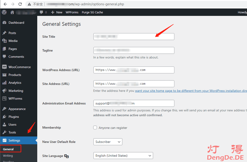 在WordPress的管理后台后设置站点标题和访问网址,菜单是:Settings—>General Settings,如图: