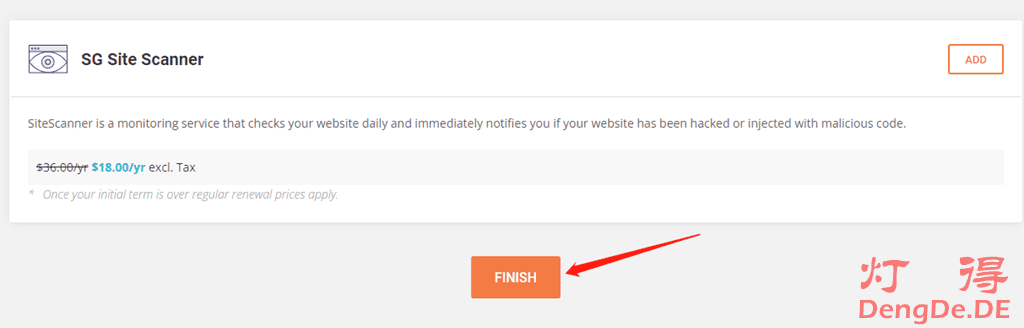 点“Continue”开始安装WordPress和WooCommerce。这时候SiteGround会向我们推销他的安全扫描服务“SG Site Scanner”,大家可以可以自己的需要来选择,如果用不上就直接点“FINISH“,如图: