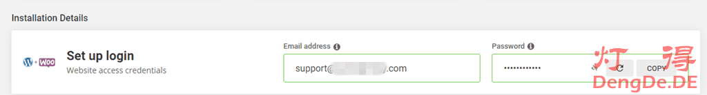 接下来需要设置WordPress的管理员帐号,你可以使用你的常用邮箱,也可以使用我们自己的域名邮箱,我选择使用域名邮箱,点“GENERATE”自动生成一个密码,记得复制保存下来,如图: