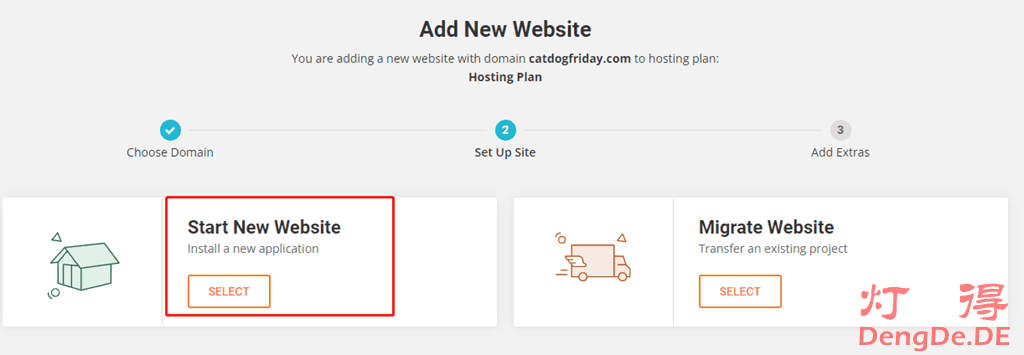 由于我们之前已经购买了域名,所以选择“Existing Domain”。如果你还没有购买域名,可以选“New Domain”注册一个。也可以先使用临时域名,等以后想到好的域名再更换掉临时域名。选好域名以后点击“Continue”。接下来这一步很关键,请选择“Start New Website”—“Install a new application”,因为我们需要安装WordPress和WooCommerce。如下图所示: