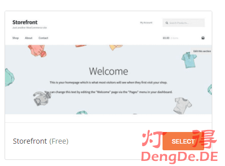 进入Wordpress网站后台,我们根据向导来选择模板,我们选择”Storefront“ 这个模板。如下图所示: