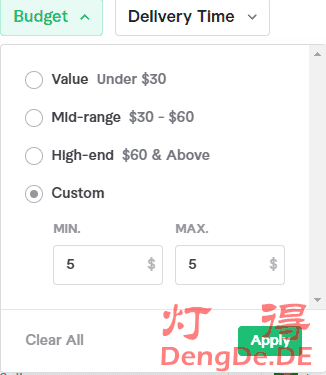 灯得找她的原因是价格便宜,做出来的LOGO看起来还不错,而且沟通比较方便。我只告诉她我的网站域名以及打算卖什么东西,然后她就给了我几个设计图让我选,上面那个看起来还不错。你也可以在Fiverr的搜索栏输入”logo design”,然后在“Budget”那里选择“Custom’,并输入“MIN=5,MAX=5”,这样就可以找出所有提供5美元做一个LOGO的卖家。如下图所示: