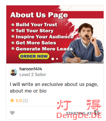 这里,我仅输入了电子邮箱进行操作演示。如果你正在做正常运营的独立站,那么请认真填写“About Us”页面的内容,让客户能更快更准确的了解你,一定要显得真实可信,不宜过于夸张。如果你英文不太好,可以自己先用中文写,然后用谷歌翻译成英语。如果你想写的地道一些,可以去Fiverr上找人帮你写,在Fiverr网站搜索关键词”about us page”,就可以找到很多提供该服务的卖家,最低仅需5美元。如下图所示:
