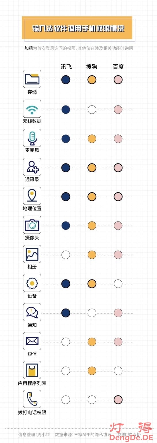 南方周末梳理三份隐私政策,输入法软件可能收集的用户信息有11类,涉及调用的手机权限有12项。如下图所示