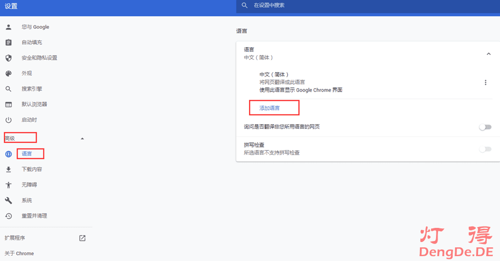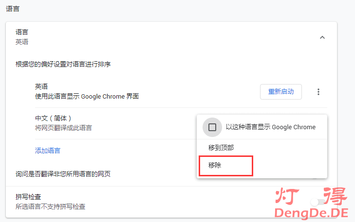 然后在左侧的“高级”菜单中选择“语言”,添加勾选英语(或者繁体中文)并选择“以这种语言显示Google Chrome”,接着选择“移除”中文(简体),重新打开Chrome浏览器。
