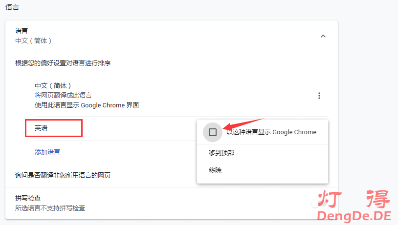 添加好之后,点击语言旁边的“三竖点”图标,勾选“以这种语言显示 Google Chrome”,设置为以“英语”显示 Google Chrome 浏览器界面。