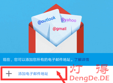 第二步:进入添加邮箱地址界面,点击“添加电子邮件地址”按钮(如果你手机曾经绑定过Gmail可能会出现旧的邮箱地址,直接点击“+”按钮即可)。