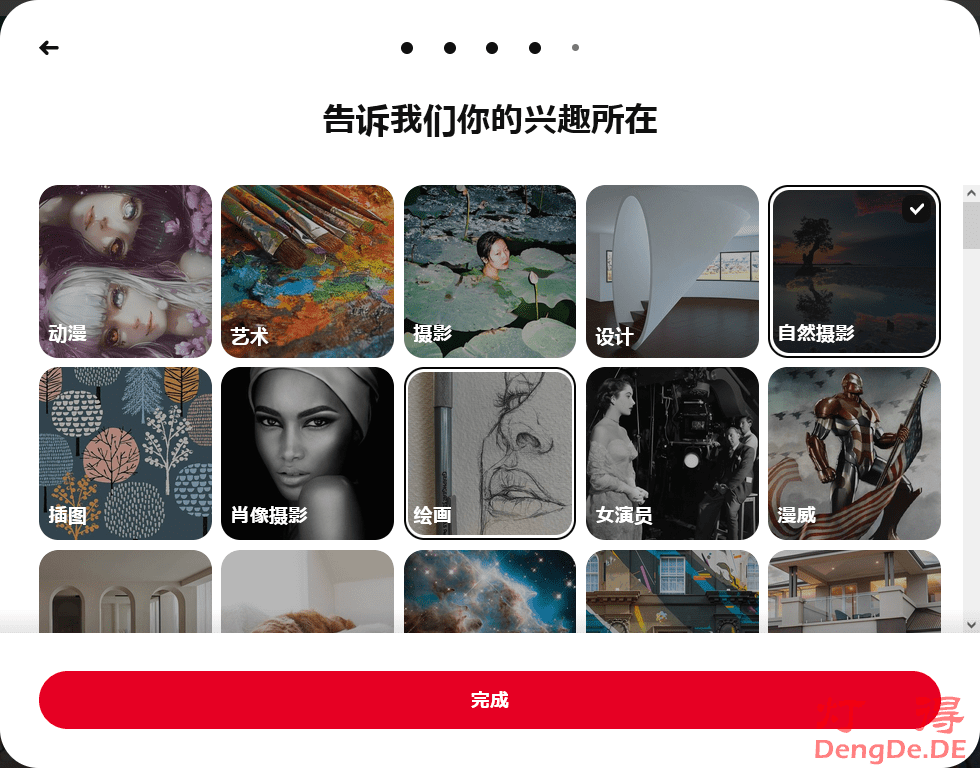 C、选择5个感兴趣的类别,以便Pinterest拼趣了解你的喜好,方便日后给你推送喜欢的内容。选择好之后,我们点击【完成】按钮,Pinterest账户就注册完成了。