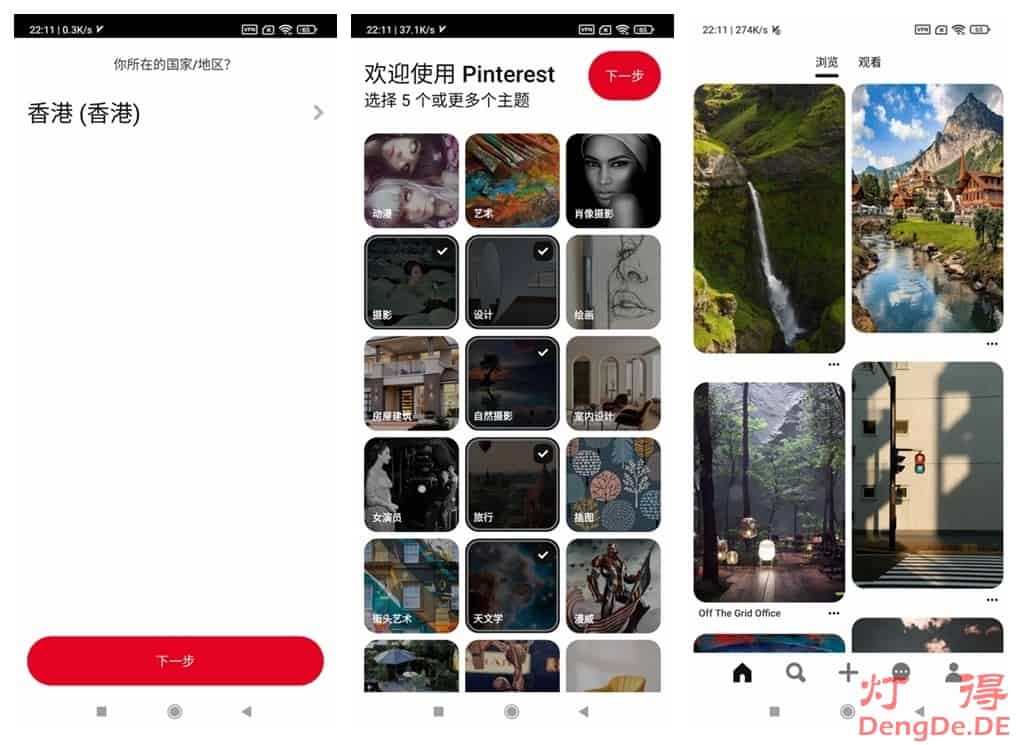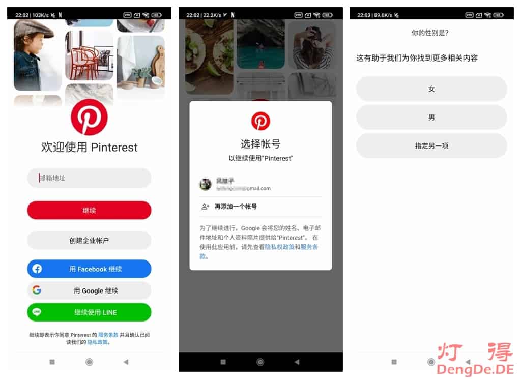 如果你平时使用手机上外网,那么你可以使用 Pinterest App 在移动手机端注册账户。使用 Pinterest App 在手机上注册账号流程与Pinterest网页版基本一致,按照提示操作即可。具体操作步骤如下图所示: