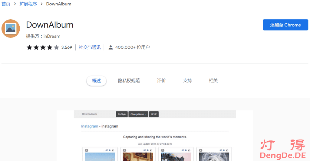 (3)在DownAlbum插件页面,我们点击右上角的“添加到 Chrome”按钮。