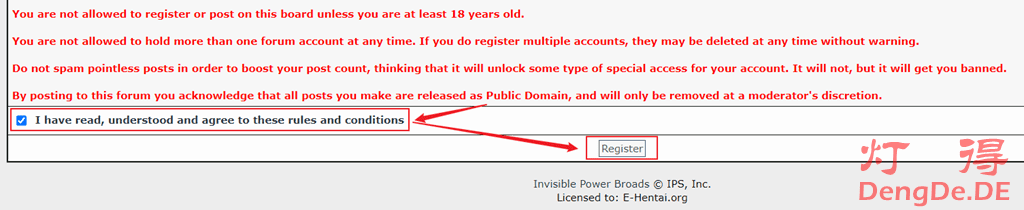 2)在弹出的登录页面,点击右下方的“register”按钮注册,进入E站的“Registration Terms & Rules”注册条款和规则页面。请在确认好之后,勾选“I have read, understood and agree to these rules and conditions”项,并点击“register”按钮,会自动进入填写注册账户信息页面。如下图所示: