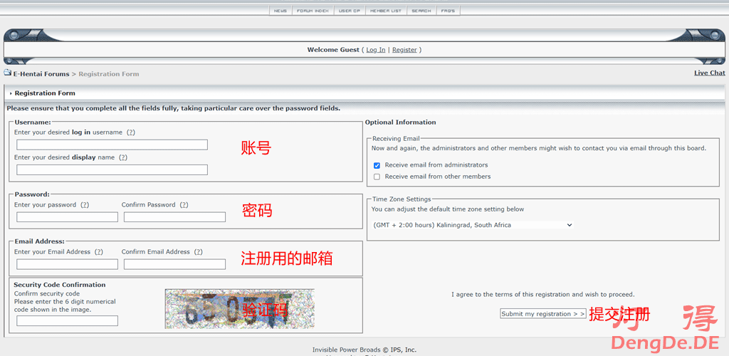 - 注册前必须把浏览器语言改成英语,使用中文、日文等语言浏览器注册的账户也无法获得E站里区的访问权限。