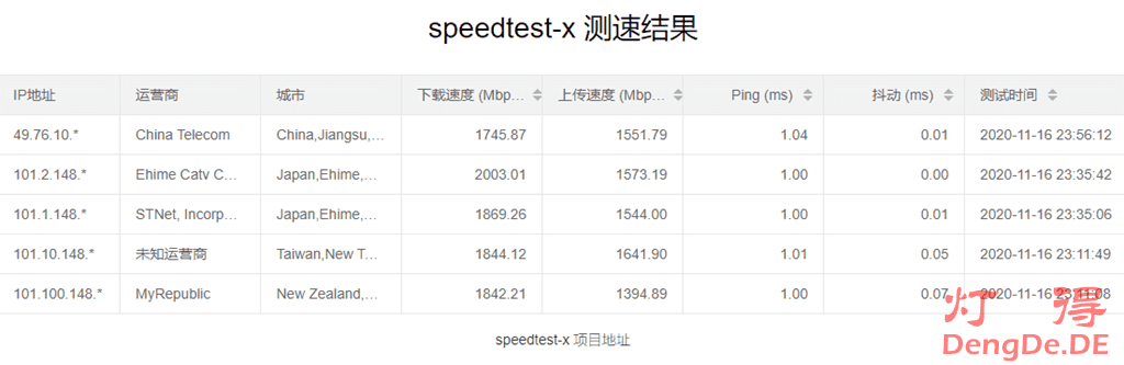 speedtest-x是 LibreSpeed 的延伸项目,LibreSpeed 是一个非常轻巧的网站测速工具。speedtest-x 使用文件数据库来保存来自不同用户的测速结果,方便您查看全国不同地域与运营商的测速效果。
