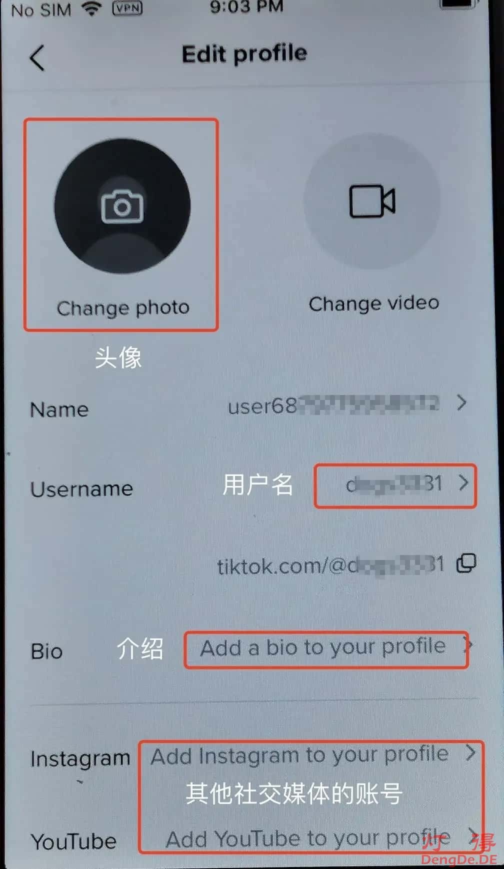 注册好TikTok账号后,在 “Me”菜单项点击“Edit profifile” 可以编辑您的TikTok账号信息,比如改名字、换 头像、添加个人简介以及其他社交媒体的账号等。