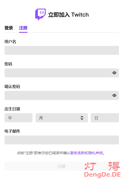 (1)先进入科学上网环境,然后打开Twitch官网,在右上角或左下角点击“注册”按钮。在弹出的注册页面,按照要求填好注册信息:昵称、密码、确认密码、出生日期和电子邮件。