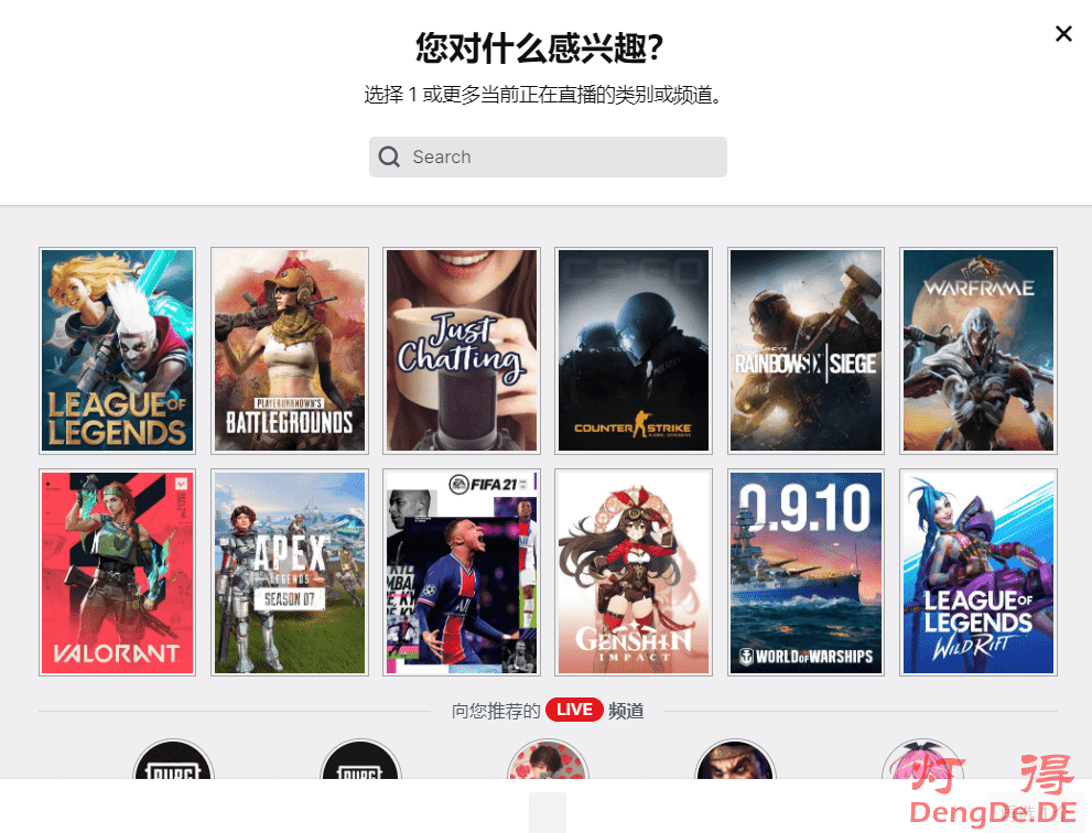 (4)验证完成后,Twitch账号就注册成功啦!然后,我们点击“选择感兴趣的内容”。选好之后,系统就会给你推送相关内容。