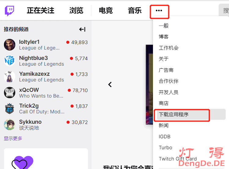 在Twitch官网就有提供App安装包的下载地址。我们进入Twitch官网,在官网首页左上角依次点击【…】-【下载应用程序】,即可进入Twitch下载页面。如下图所示: