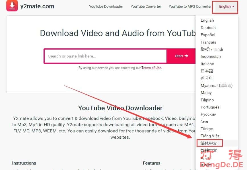 在y2mate.com网站页面选择自己最熟悉的语言,比如我这里把它的语言版本切换成“简体中文”。如下图所示:
