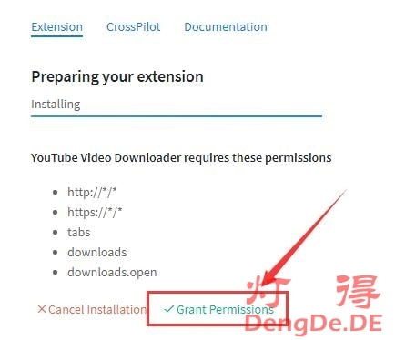(5)在新打开的页面上,点击“Grant Permissions”允许程序下载视频,并点击弹窗上的“允许”按钮。