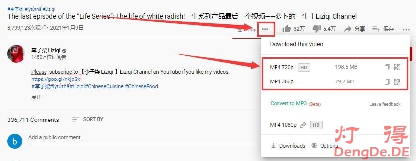 (9)当我们点击“下载”按钮后,会弹窗提示你,选择将视频保存在哪个文件夹中。你也可以点击“下载”按钮后面的“个小点”按钮,然后选择你想要下载的Youtube视频的分辨率,比如 720P 或 360P 等,如下图所示: