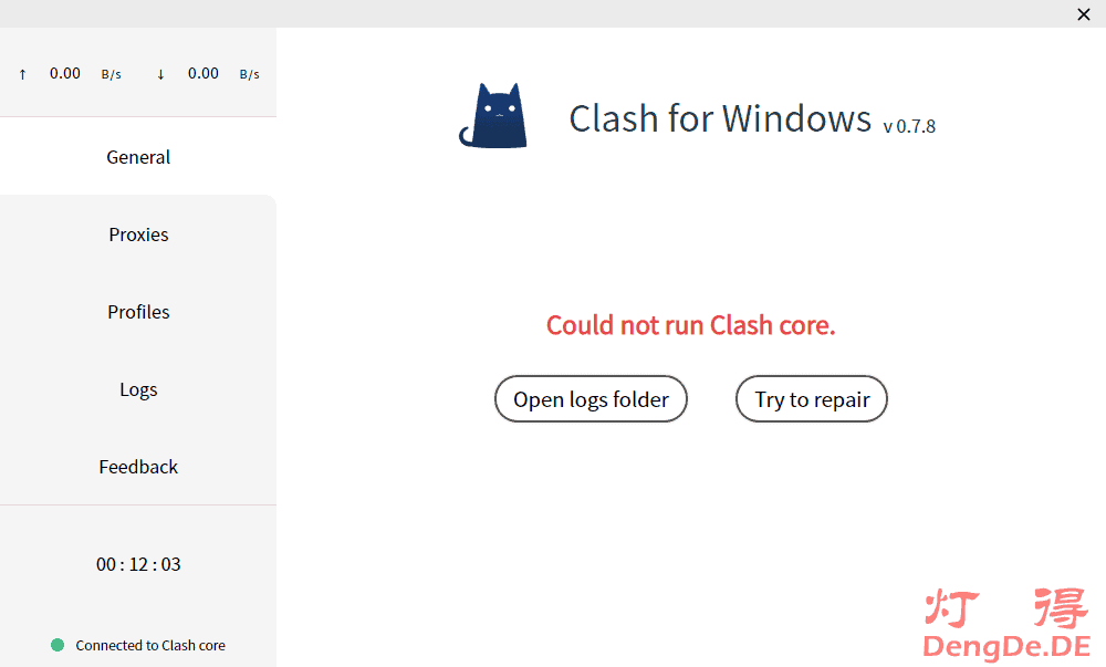 这是 Clash 的启动文件,位于Home Directory中,如果此文件有错,则 Clash 核心将无法启动,一般会出现如下界面: