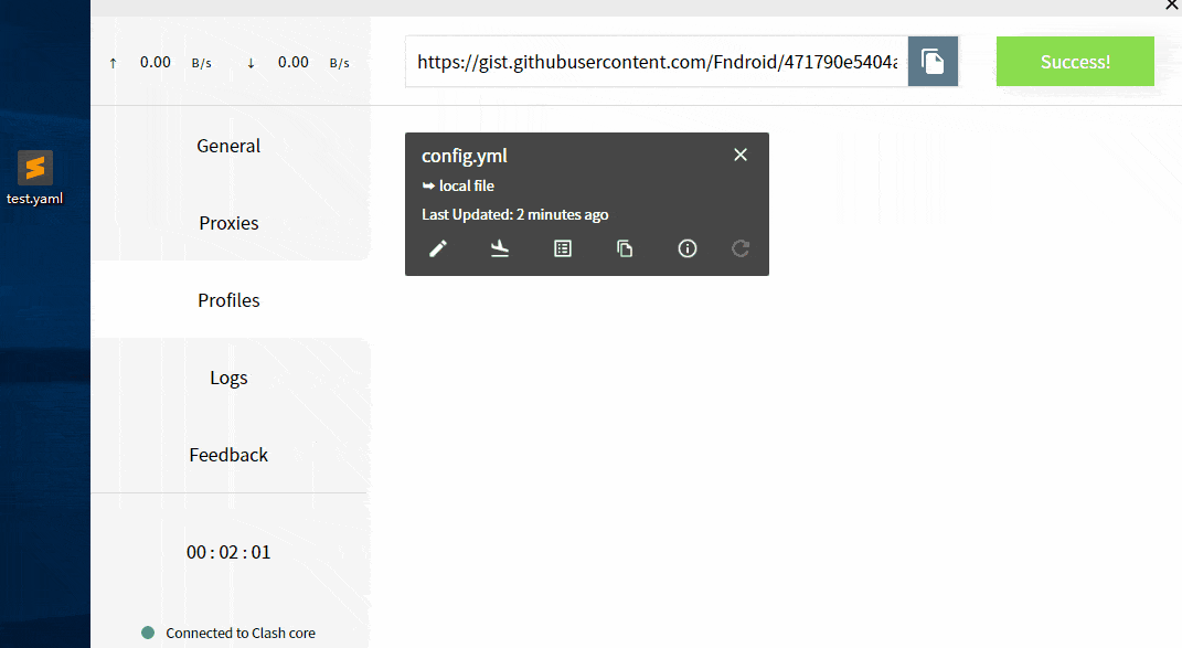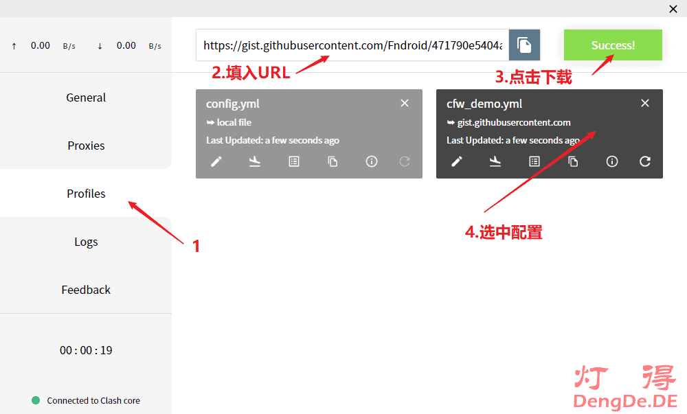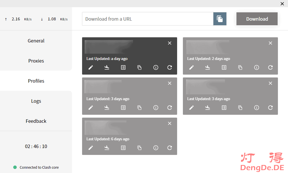 点击界面左侧菜单 Profiles,在顶部输入框填入 URL 并点击 Download 即可,下载完成后点击对应的配置文件即可载入
