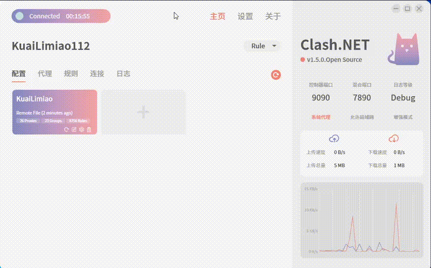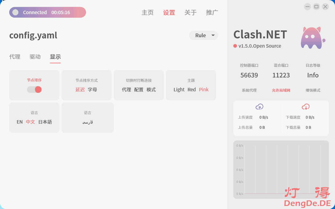 截至目前,Clash .NET 1.2.8 是最新版,也是此作品的最后一个版本(作者已删库),界面支持11种主题样式和7种语言模式,可自由切换。