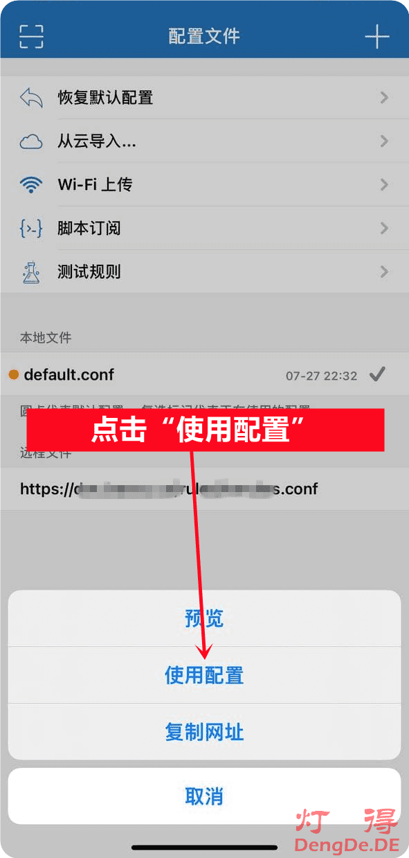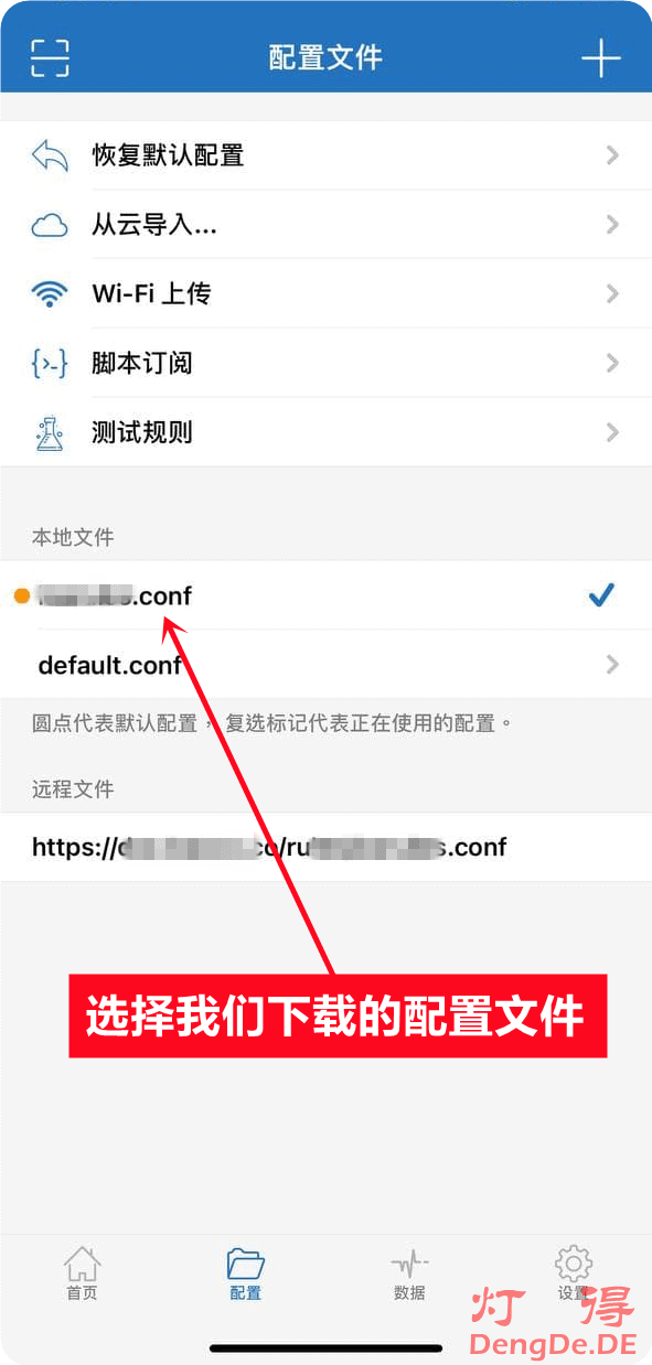 1)在Shadowrocket主界面,我们点击下面的【配置】按钮,进入【配置文件】界面。