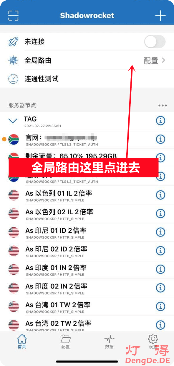 6)返回Shadowrocket主界面,然后在【全局路由】项,改成“配置”,就可以选择节点链接使用了。